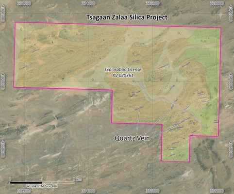 The Tsagaan Zalaa project is located in Saikhandulaan soum, Dornogovi Province, in southeastern Mongolia (Figure 1). It is connected with a road to Sainshand, capital of the Dornogovi Province in the Eastern Gobi steppe, approximately 95 km to the east, located along the Trans-Mongolian Highway and Railway connecting Mongolia’s capital city of Ulaanbaatar with China. Sainshand is 200 kilometres from the Chinese border and serves as the local depot for silica and other mineral exports to China. Tsagaan Zalaa (Figure 2) is also situated only 18 km from the local community of Saikhandulaan soum(Figure 3) and covers an area of 1,670.28 hectares. The Project is strategically positioned to serve the growing regional demand for high-purity quartz silica (“HPQ”). Massive high-purity quartz veins up to 5 metres in width (Figures 4 and 5) hosted by Upper-Middle Devonian sediments are exposed on surface across the Project. In February 2025, the Company announced the submission of the Mining License application, with today’s achievement marking the decisive regulatory confirmation needed to advance the Project toward the final operating approval.