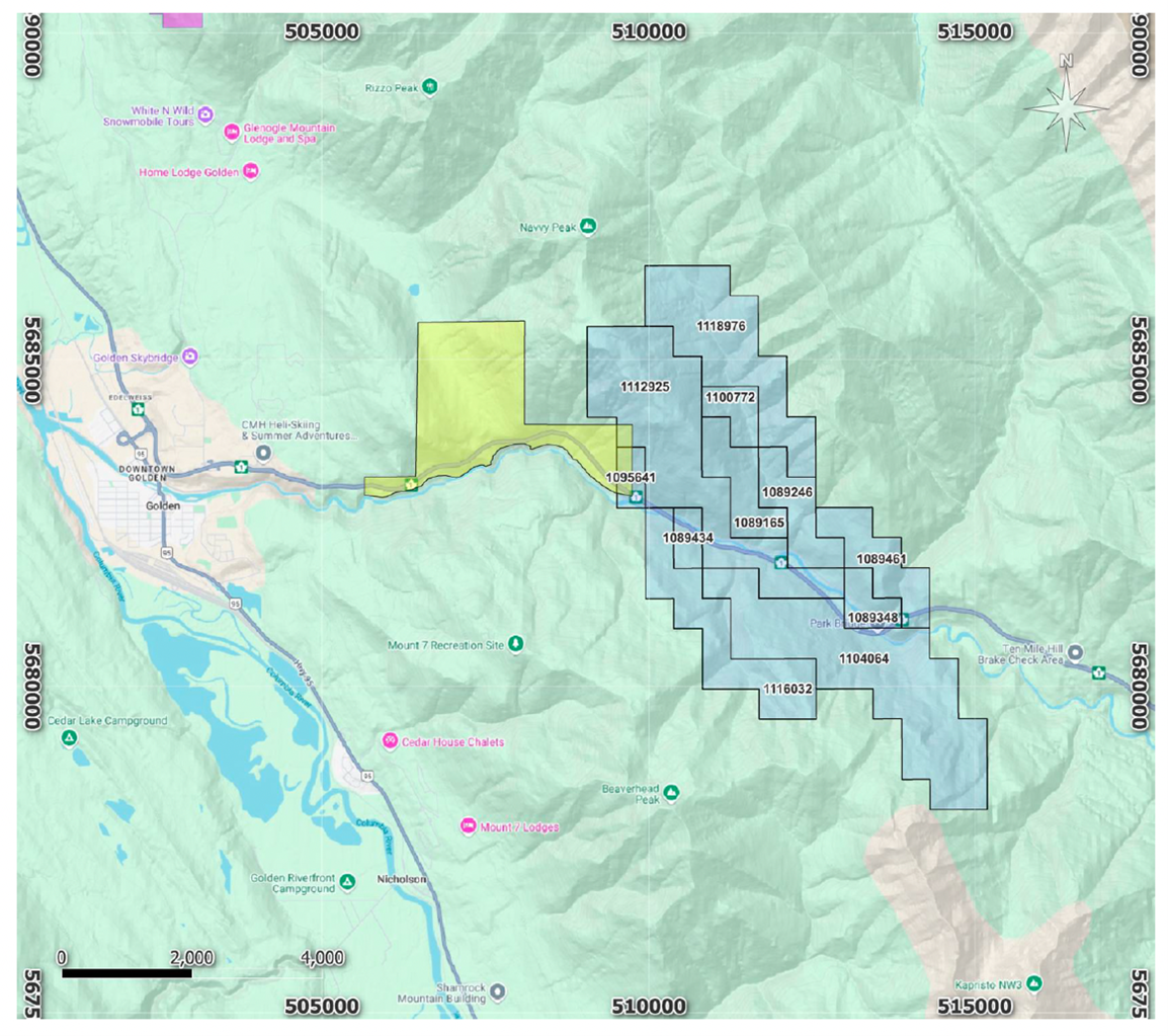 The Table Mountain Silica Project is located approximately 4 kilometres east of Golden, B.C., Canada, with excellent year-round road access and proximity to the Canadian Pacific Railway’s Golden rail yard (Figure 2). The property covers roughly 2,304 hectares, encompassing up to 10 kilometres of regionally mapped strike length of the Mount Wilson Formation quartzite, with widths ranging from 300 to 1,400 metres at surface. Table Mountain is strategically situated near two established high-purity silica operations – the Moberly Silica Mine and the Sinova Quartz Quarry – both of which demonstrate silica purity greater than 99.6% SiO₂. This advantageous location highlights the project’s potential to become a significant source of high-purity silica in a region known for hosting premium-quality silica deposits.