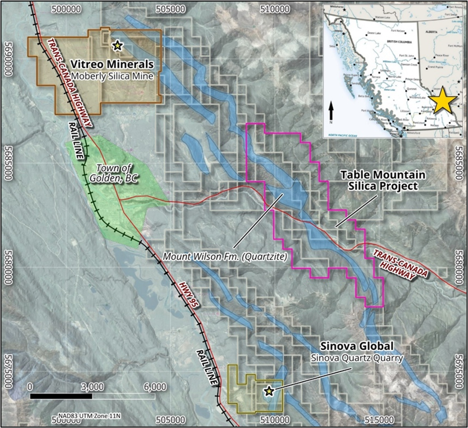 The Table Mountain Silica Project is located approximately 4 kilometres east of Golden, B.C., Canada, with excellent year-round road access and proximity to the Canadian Pacific Railway’s Golden rail yard. The property covers roughly 2,526 hectares, encompassing up to 11 kilometres of regionally mapped strike length of the Mount Wilson Formation quartzite, with widths ranging from 300 to 1,400 metres at surface. Table Mountain is strategically situated near two established high-purity silica operations – the Moberly Silica Mine and the Sinova Quartz Quarry. This advantageous location highlights the project’s potential to become a significant source of high-purity silica in a region known for hosting premium-quality silica deposits.