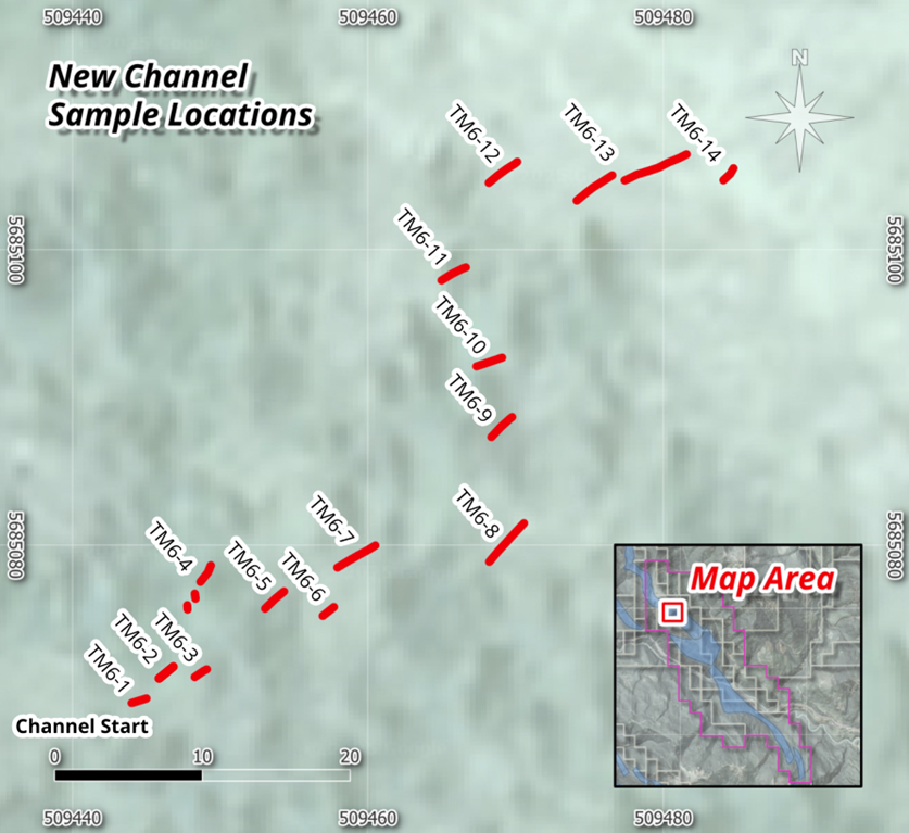 Channel sampling was conducted at the Table Mountain Zone, with results consistently similar to the sampling results achieved during 2024. Sampling procedure consisted of continuous chip sampling along a 3-centimetre cut channel. Samples were taken continuously over 1-metre intervals perpendicular to the strike orientation of the outcrop, with the sample sequence starting from the southwest end of the channel. Intervals shorter than 20 centimetres were combined with the previous interval. 45 continuous chip channel samples were collected over 41.35 metres within a 54.50-metre sampling zone, returning a weighted average of 98.59% SiO₂.