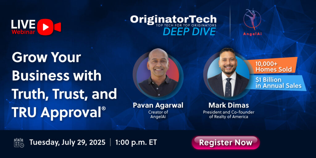 OriginatorTech Deep Dive, a collaborative education series for forward-thinking finance and real estate professionals, will spotlight a groundbreaking solution that has redefined the home buying experience. The session will feature tech visionary Pavan Agarwal, CEO and Founder of AngelAi, joined by Mark Dimas, President and Co-Founder of Realty of America to discuss the critical role of transparency, truth and technology.