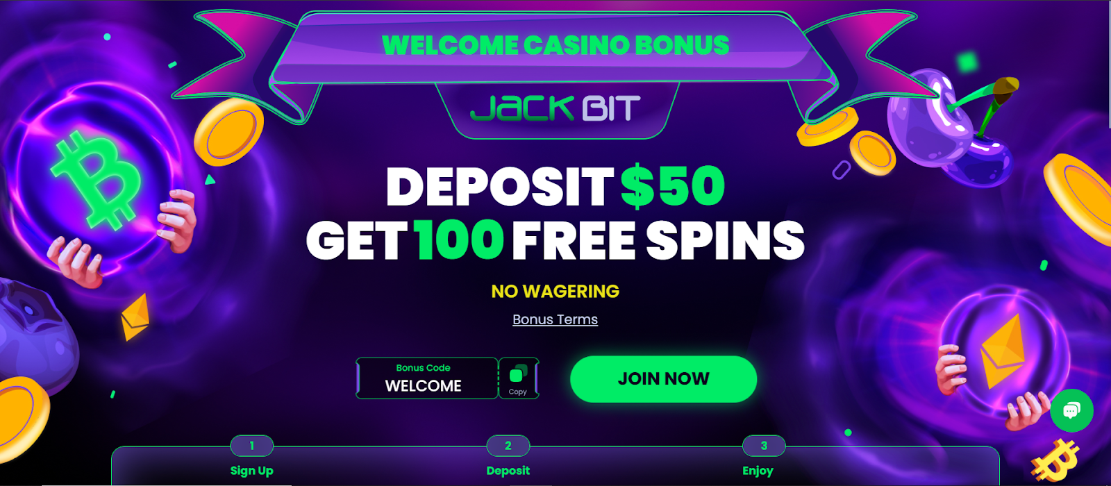 Jackbit: 100 no wager free spins with $50 minimum deposit, code WELCOME