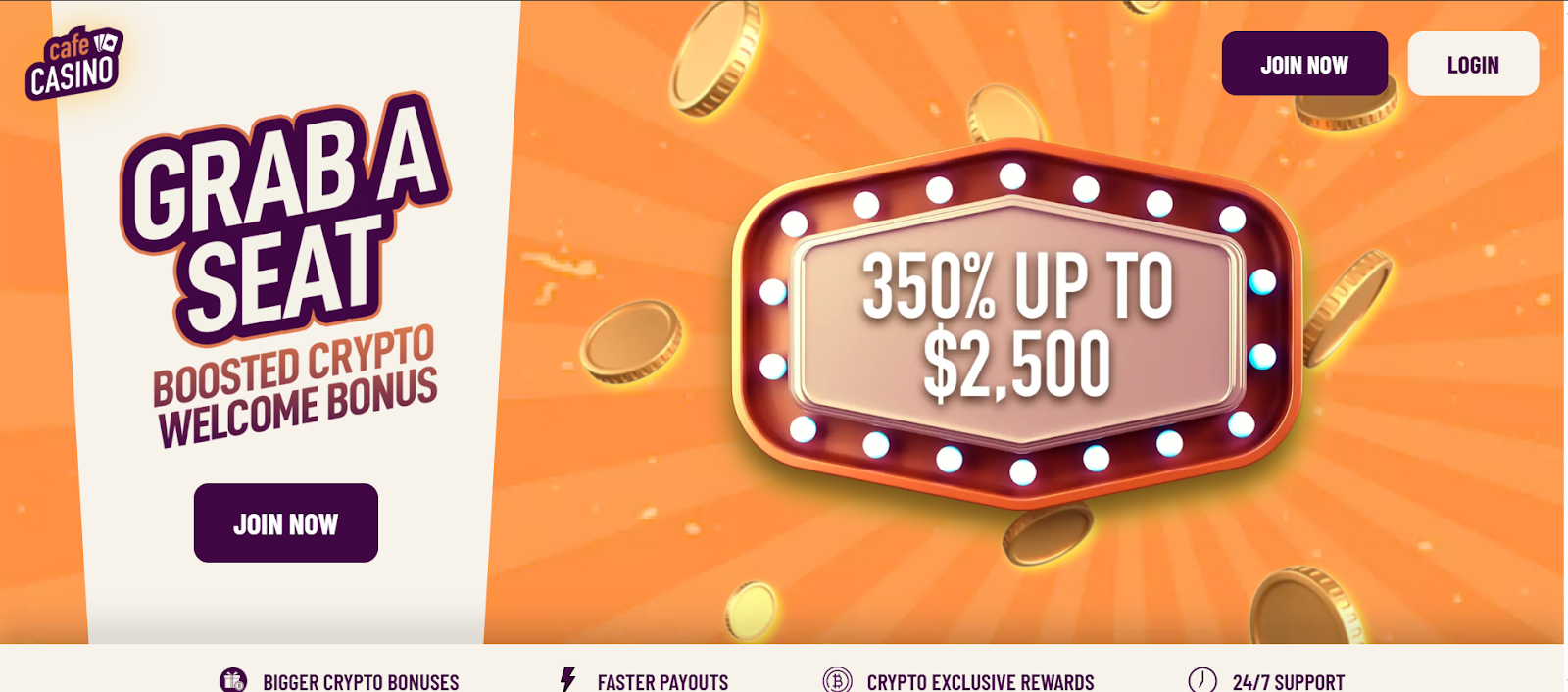 Cafe Casino: 250% match bonus up to $1,500 (credit cards) / 350% up to $2,500 (crypto)