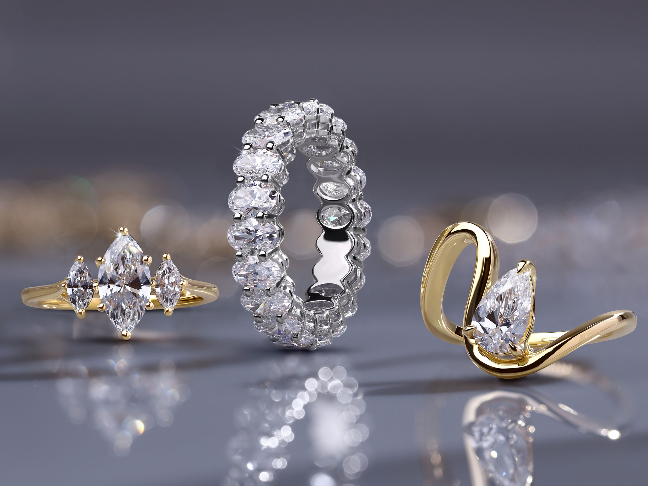 For couples, love takes center stage with creations like the Curved Shank Dewdrop Ring, Marquise Trinity Vows Ring, and Round Eternity Band. Each design embodies the enduring nature of togetherness. Men can also discover the Emerald Encompassing Groove Band, a bold reflection of strength and devotion.