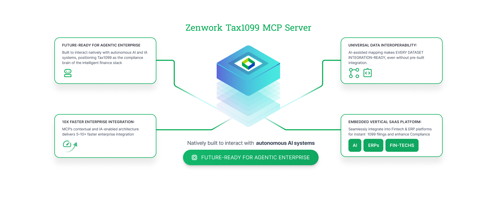 Today, Zenwork Tax1099 has released its Model Context Protocol (MCP) server that can manage, validate, and file Information returns directly via integrations initiated through simple, conversational commands. Providing complete integrations, reducing the need for manual form-filling and hours of administrative tasks. It integrates AI with tax automation through the MCP framework, allowing access to all validation and eFiling features.